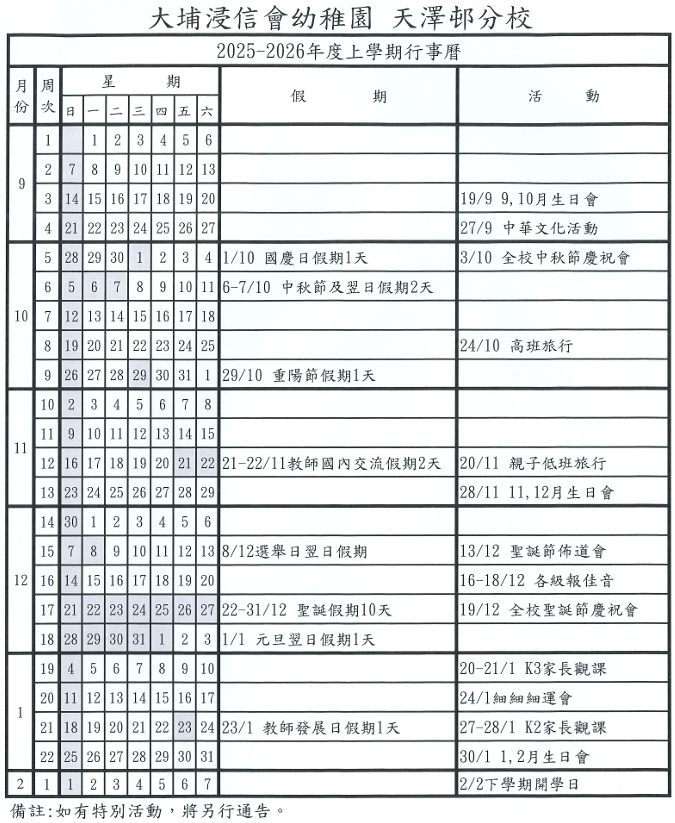 校園日曆 School Calendar